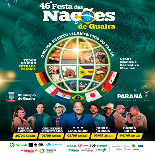 A programação inicia na noite de quarta-feira (30), as 20hrs, com abertura oficial da 46ª Festa das Nações de Guaíra. Na sequência, as 23hrs, o show com Naiara Azevedo promete animar a noite.