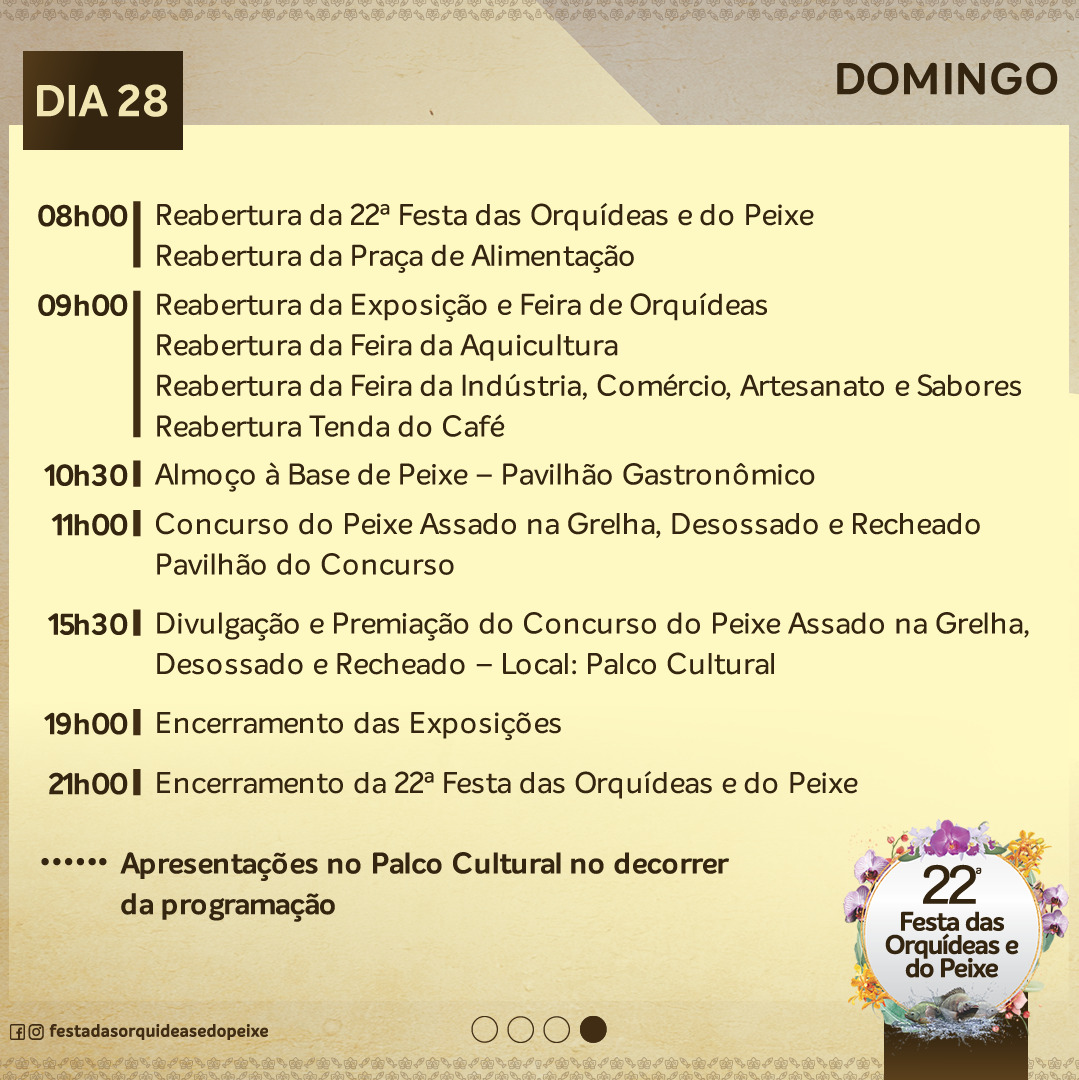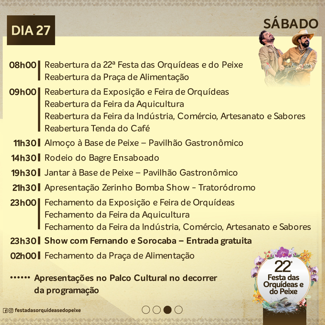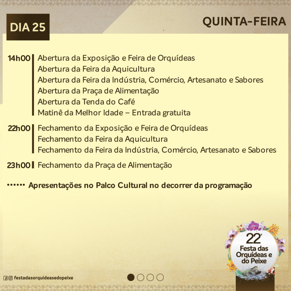 Nos quatro dias de festa, o público pode visitar a Exposição e Feira de Orquídeas, a Feira da Aquicultura, a Feira da Indústria, Comércio, Artesanato e Sabores, a Tenda do Café, a Praça de Alimentação e atrações no Palco Cultural.