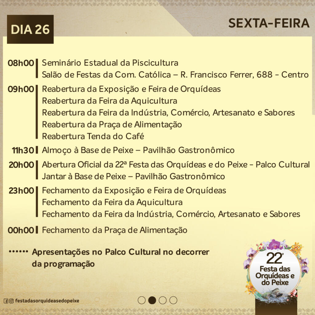 Os visitantes vão apreciar uma boa gastronomia com refeições à base de peixe, tenda do café e praça de alimentação. Vão encher os olhos com a beleza e variedade dos mais de 50 mil exemplares de orquídeas que estarão à venda nos quatro dias de festa, além de ficar por dentro das últimas novidades do mercado na área da aquicultura, com mais de 20 empresas expositoras durante a Feira da Aquicultura. Já a Feira da Indústria, Comércio, Artesanato e Sabores conta com mais de 50 empresas expositoras, oferecendo produtos e serviços variados.