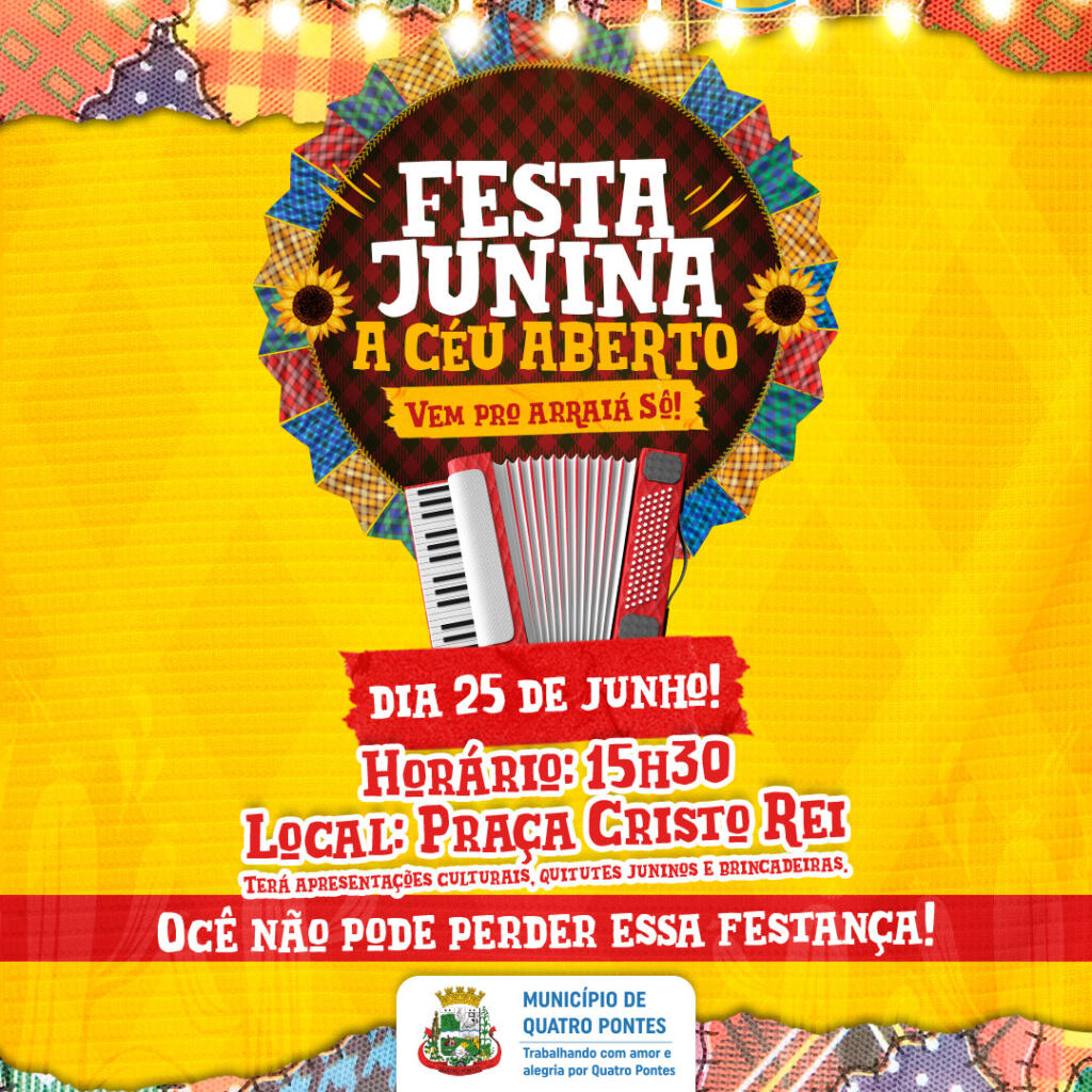 A Praça Cristo Rei de Quatro Pontes será palco da 5ª edição da Festa Junina a Céu Aberto no domingo (25). O evento iniciará a partir das 15h30, sendo organizado pela prefeitura com o envolvimento de todas as secretarias. A festa junina é pública e tem o objetivo de celebrar o Dia de São João. A expectativa é reunir cerca de três mil pessoas.