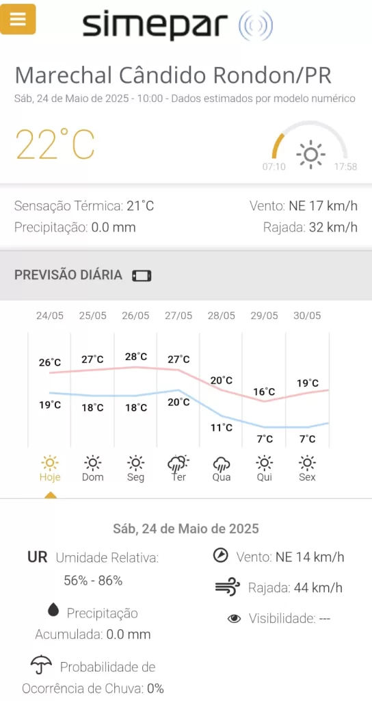 Veja a previsão para os próximos dias em Marechal Rondon, segundo o Simepar: