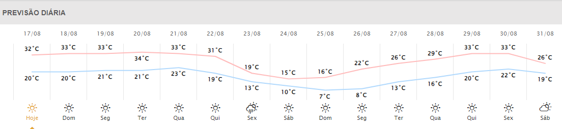 Toledo: Em Toledo, o sábado será de tempo firme, com temperaturas oscilando entre 20°C e 29°C. No domingo, a previsão é de mínimas em torno de 20°C e máximas podendo atingir 30°C. A presença do sol será quase contínua, com baixa possibilidade de nuvens e nenhuma expectativa de chuva.