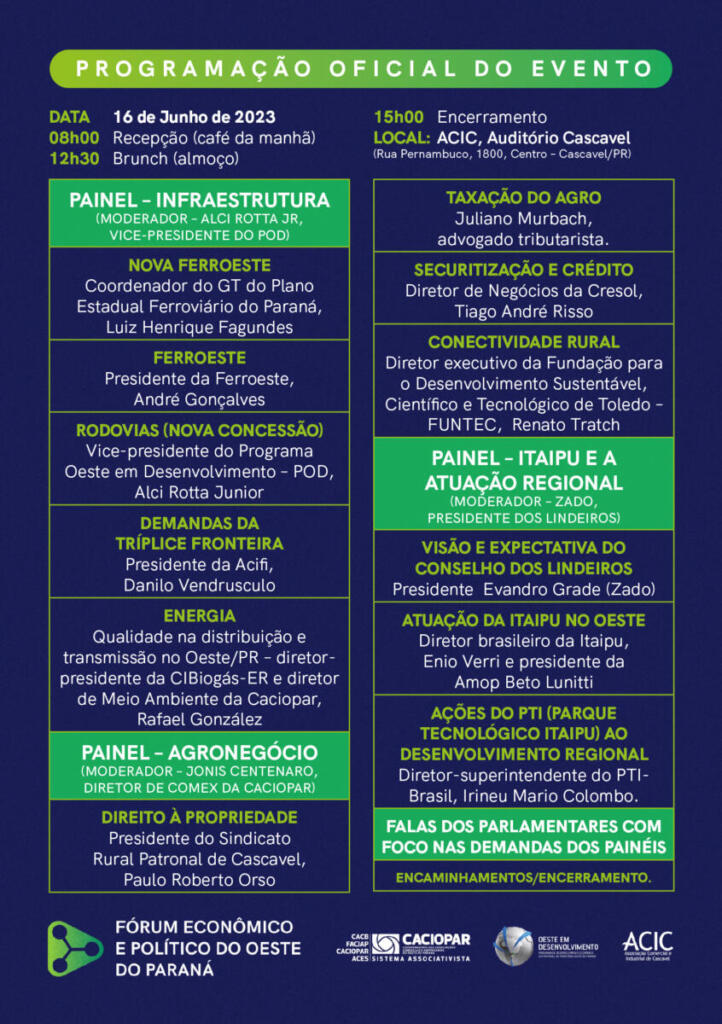 O fórum vai aprofundar debates também sobre agronegócio e atuação da Itaipu no Oeste do Paraná. As inscrições para o evento são gratuitas e podem ser feitas no site acessando então o banner do fórum (clique aqui). Até agora, cinco deputados confirmaram presença nos debates, são eles: Marcio Pacheco (Republicanos), Oziel Luiz/Batatinha (MDB), Marcel Micheleto (PL), Luis Corti (PSB), estaduais e Elton Welter (PT), federal.