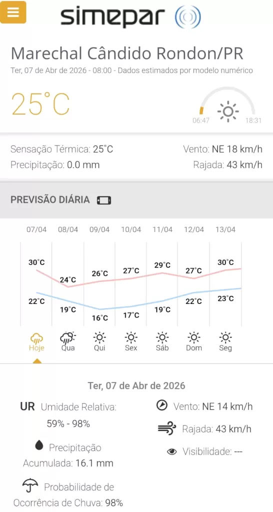 Em Cascavel, a previsão é de 7,5 milímetros de chuva, com temperaturas entre 21°C e 27°C. Em Marechal Cândido Rondon, o acumulado pode chegar a 16,1 milímetros, com mínima de 24°C e máxima de 28°C.