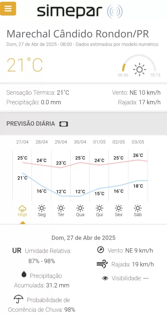 Em Marechal Cândido Rondon o domingo está nublado e a mínima é de 21ºC. Ao longo do dia a máxima deve chegar a 25ºC. O Simepar prevê 31 milímetros de chuva para hoje. Veja abaixo a previsão para os próximos dias.