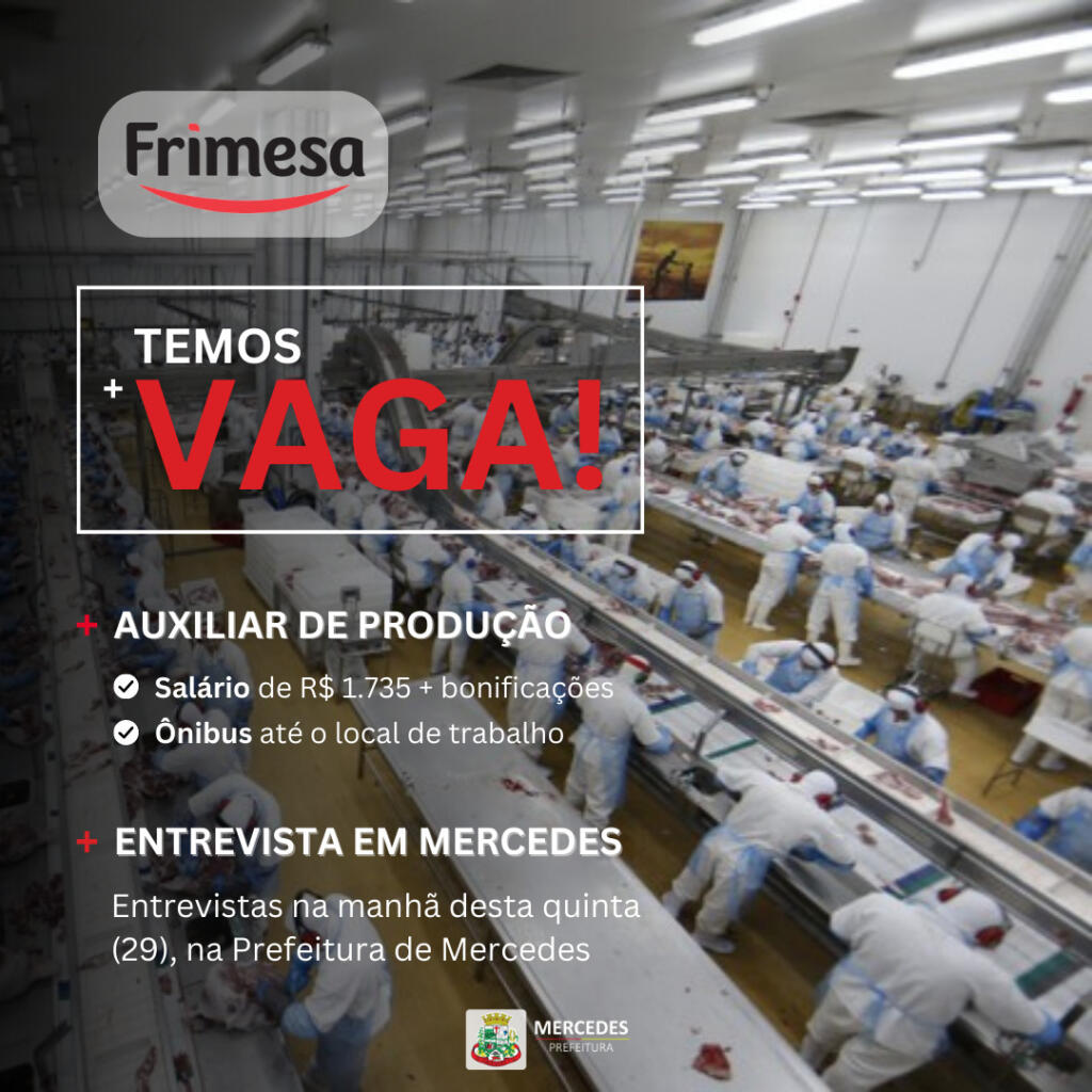A Frimesa está com oportunidades de trabalho abertas para trabalhadores de Mercedes. Nesta quinta-feira (29) serão realizadas entrevistas para os interessados. As vagas são para auxiliares de produção e os salários são de R$ 1.735 + bonificações.