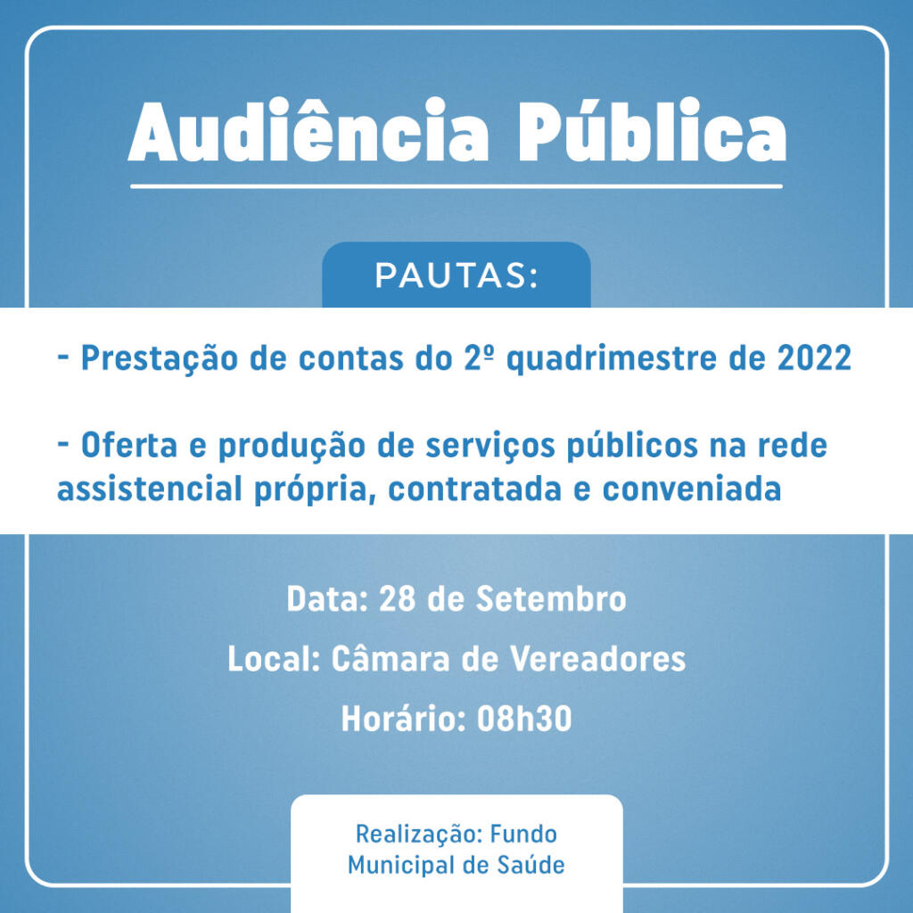 A Prefeitura de Quatro Pontes, por intermédio do Fundo Municipal de Saúde, realizará na quarta-feira (28) uma audiência pública junto à Câmara de Vereadores, iniciando às 08h30. Conforme o edital, a convocação é para a população em geral participar.