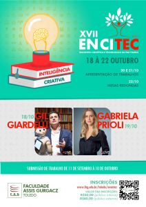 Estão abertas as inscrições para o XVII Encontro Científico e Tecnológico da FAG Toledo que neste ano terá como tema “Inteligência Criativa”. Serão cinco dias de atividades, iniciando no dia 18 de outubro com a palestra online com Gil Giardelli. No dia 19 de outubro acontece a palestra online com Gabriela Prioli. “O tema está vinculado à capacidade de pensar e raciocinar, resolver problemas de forma criativa, multidisciplinar, pensando na busca de soluções para diferentes tipos de situações e a partir daí, preparar o nosso acadêmico para ser um solucionador, criativo e que rompa com os padrões e estereótipos”, explica Maristela Bendo, responsável pelo evento e pela Coordenação de Pesquisa e Extensão (Coopex) da FAG Toledo.