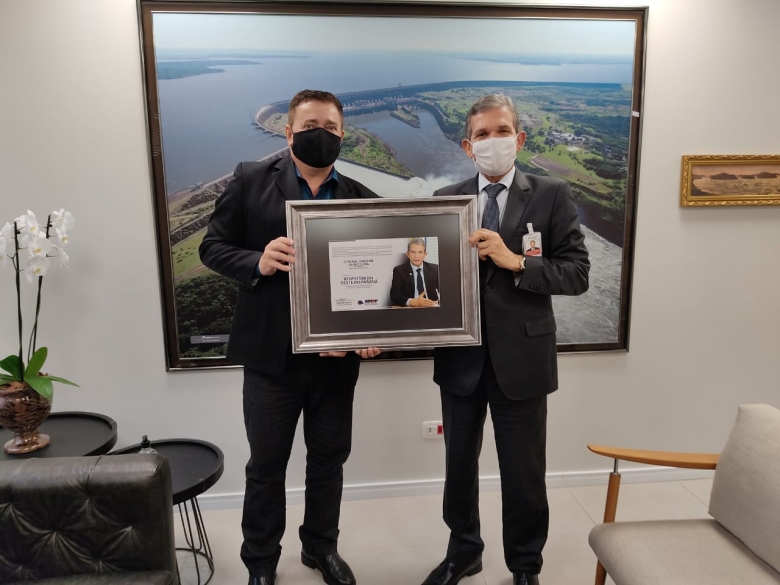 O presidente da Associação dos Municípios do Oeste do Paraná (Amop) e prefeito de Matelândia (PR), Rineu Menoncin, o Teixeirinha, entregou uma placa com o título de Benfeitor do Oeste do Paraná ao diretor-geral brasileiro da Itaipu, general Joaquim Silva e Luna, na tarde desta quarta-feira (27), no Centro Executivo da binacional, em Foz do Iguaçu (PR).
