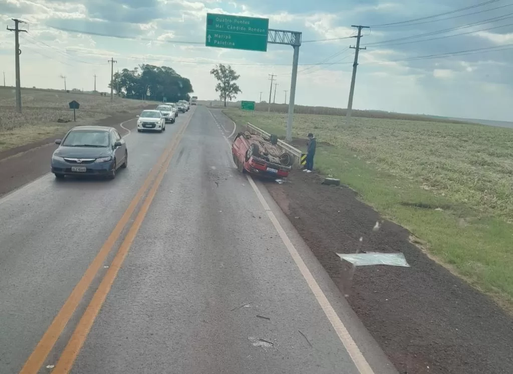 Um veículo Volkswagen Gol tombou na tarde desta sexta-feira (11) na rodovia PR-182, nas proximidades do trevo de acesso ao distrito de Vila Nova, em Toledo. O automóvel ficou com as rodas para cima às margens da pista.