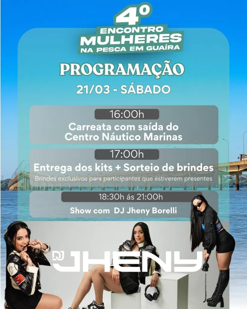 A programação começa no sábado, 21 de março, às 16 horas, com carreata a partir do Centro Náutico Marinas. Às 17 horas, ocorre a entrega de kits e o sorteio de brindes exclusivos para as participantes presentes. À noite, das 18h30 às 21 horas, o público acompanha o show com a DJ Jheny Borelli, que leva animação e promove momentos de confraternização.