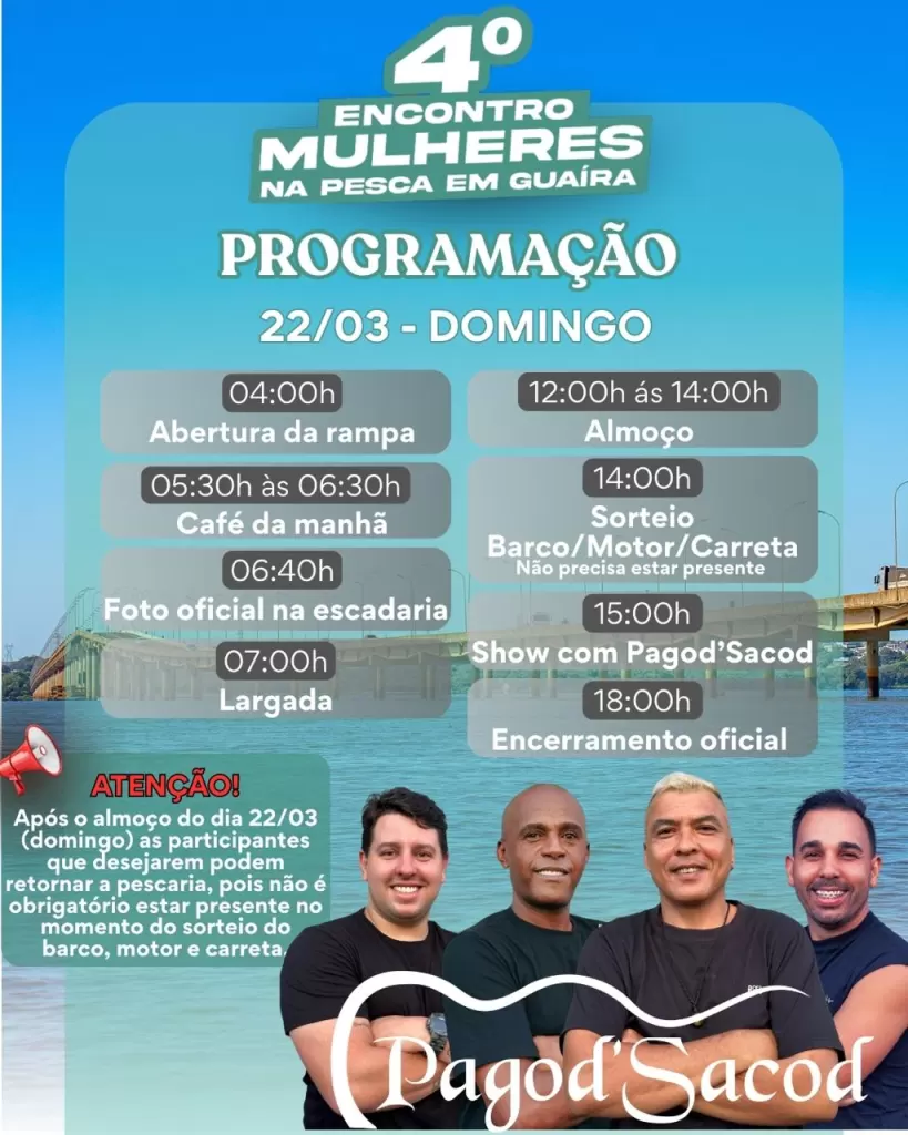 Atenção: após o almoço de domingo, as participantes que desejarem podem retornar à pescaria. Não há obrigatoriedade de presença no momento do sorteio do barco, motor e carreta.