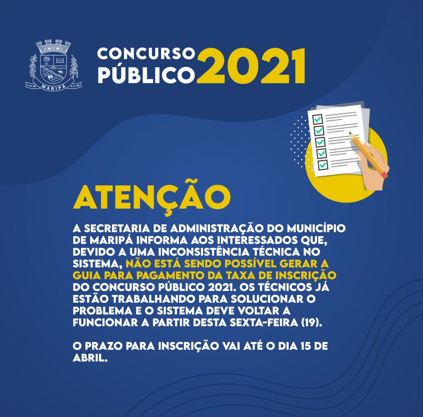 A Secretaria de Administração do Município de Maripá informa aos interessados que, devido a uma inconsistência técnica no sistema, não está sendo possível gerar a guia para pagamento da taxa de inscrição do Concurso Público 2021. Os técnicos já estão trabalhando para solucionar o problema e o sistema deve voltar a funcionar a partir de hoje (19).