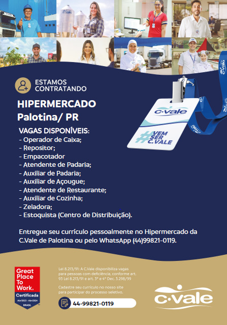 Os interessados devem entregar o currículo no Hipermercado da C.vale de Palotina ou pelo whatsapp (44) 99821-0119.