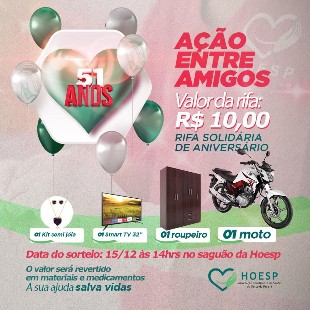 E para que possamos continuar todo esse trabalho precisamos de você. Nessa semana do aniversário a Hoesp lançou a campanha da Rifa Solidária. São quatro prêmios, uma moto, um roupeiro, uma TV Smart 32’, e um kit semi joia.
