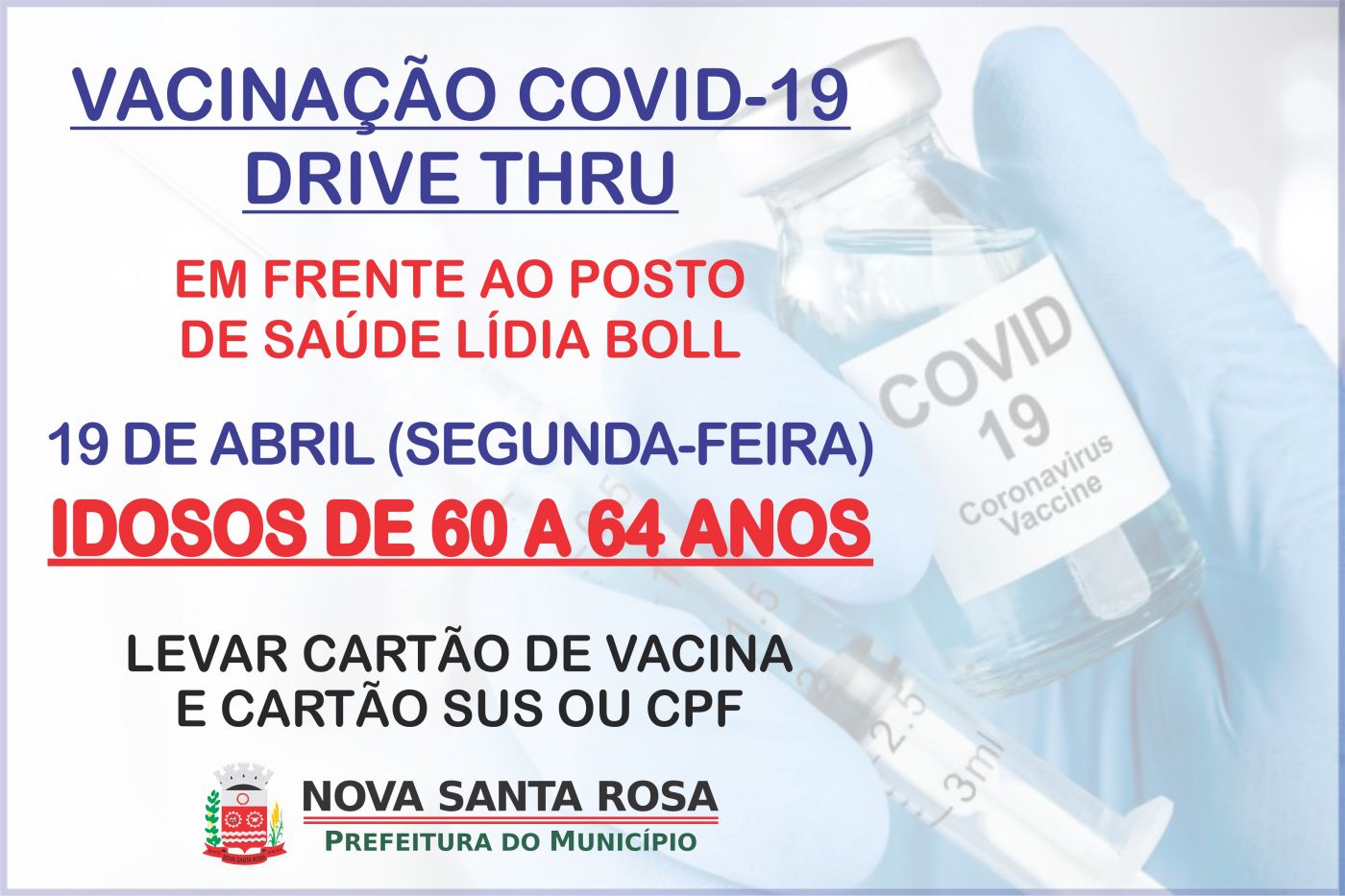 A Secretaria de Saúde de Nova Santa Rosa informa que os idosos com idade entre 60 a 64 anos serão vacinados nesta segunda-feira (19) no município. A aplicação da vacina será feita por meio do sistema drive thru em frente ao Posto de Saúde Lídia Boll. A vacinação inicia às 8 horas e segue até às 17 horas sem fechar ao meio dia. É necessário levar o cartão de vacina e cartão SUS ou CPF.