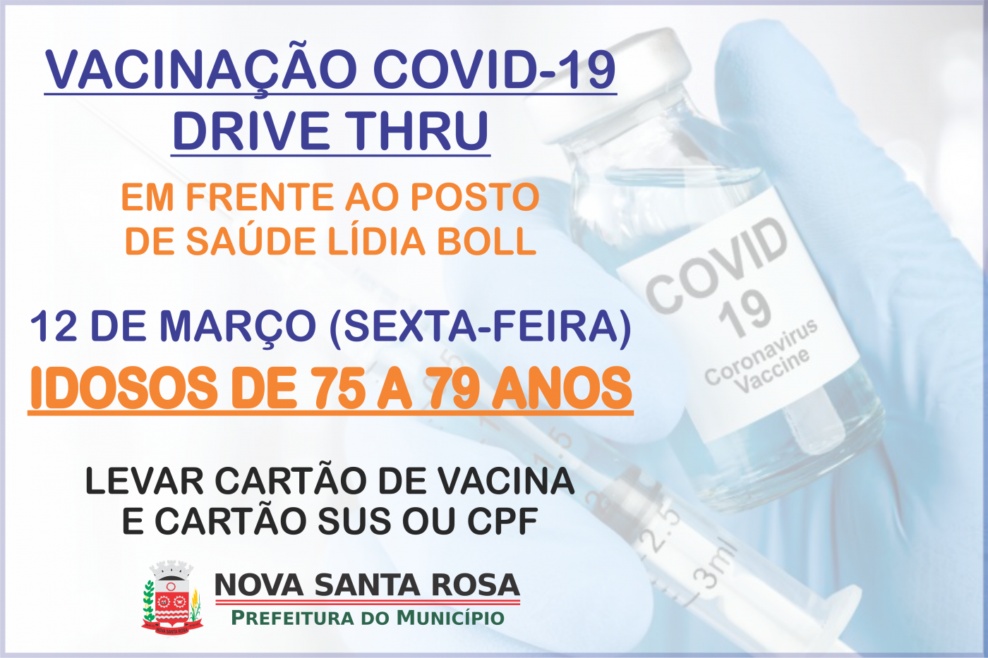 A Secretaria de Saúde da Prefeitura de Nova Santa Rosa informa que os idosos com idade entre 75 a 79 anos serão vacinados nesta sexta-feira (12) no município. A aplicação da vacina será feita por meio do sistema drive thru em frente ao Posto de Saúde Lídia Boll. A vacinação inicia às 8 horas e segue até às 17 horas sem fechar para o almoço. É necessário levar o cartão de vacina e cartão SUS ou CPF.