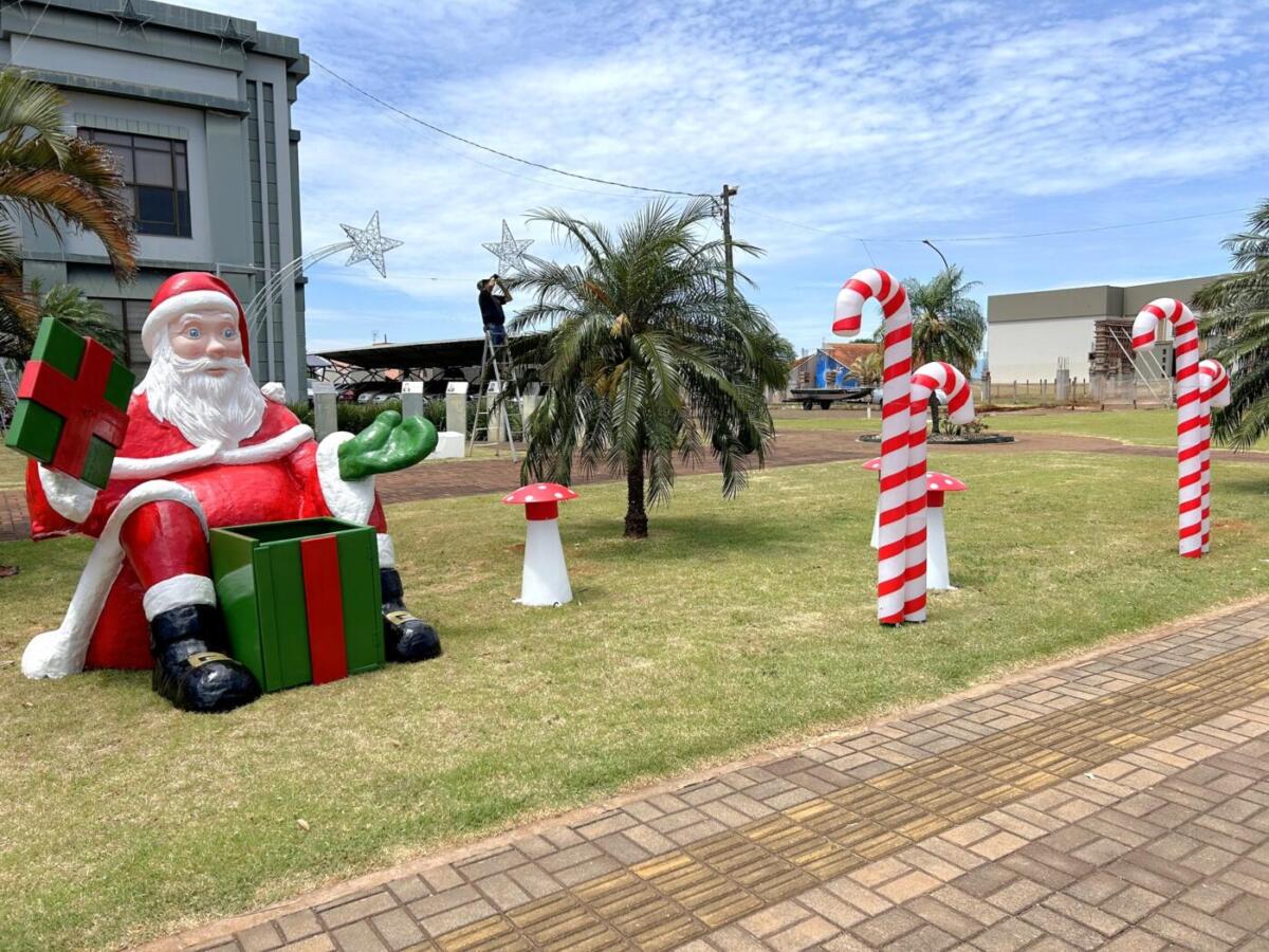 A decoração conta com papais-noéis, árvore de natal, papai-noel gigante, presépio iluminado, bolas gigantes, presentes decorativos e pisca-piscas.