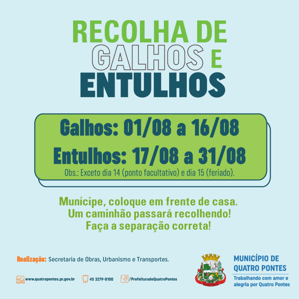 A Secretaria de Obras, Urbanismo e Transportes de Quatro Pontes iniciou nesta terça-feira (1º) o cronograma de agosto da coleta de galhos na área urbana. A comunidade deve fazer a disposição em frente de casa, pois um caminhão passará recolhendo. Esta recolha será finalizada no dia 16, exceto no dia 14, em vista de ponto facultativo, e dia 15, feriado municipal em alusão à Padroeira Nossa Senhora da Glória.