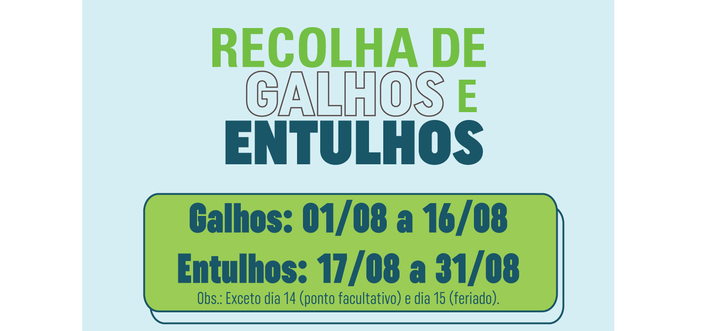 Já do dia 17 a 31 ocorrerá a coleta de entulhos, desde madeiras, restos de construção e outros materiais. Lembrando que a secretaria não pode fazer a recolha de materiais que não são entulhos, como móveis, colchões e outros, pois não consegue dar a destinação correta.
