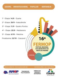 Promovido pela Associação dos Municípios do Oeste do Paraná (AMOP) em parceria com a Itaipu Binacional, a edição deste ano será realizada de forma híbrida. A apresentação será presencial seguindo todos os protocolos sanitários de segurança e o público poderá acompanhar pela transmissão ao vivo, no Facebook da AMOP.
