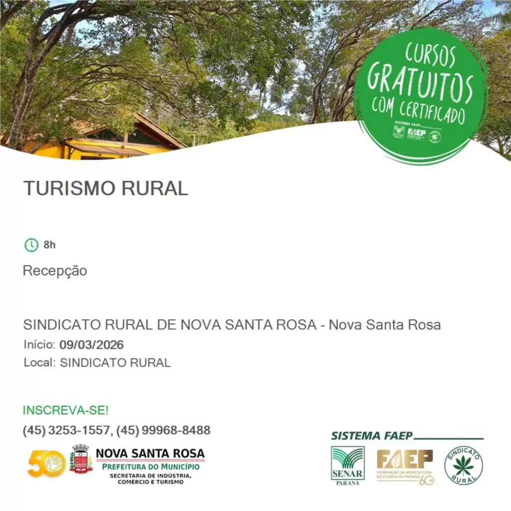 Com o apoio da Secretaria de Indústria, Comércio e Turismo de Nova Santa Rosa, o Serviço Nacional de Aprendizagem Rural (SENAR), por meio do Sindicato Rural de Nova Santa Rosa, está com inscrições abertas para dois cursos gratuitos voltados ao fortalecimento do Turismo Rural no município.