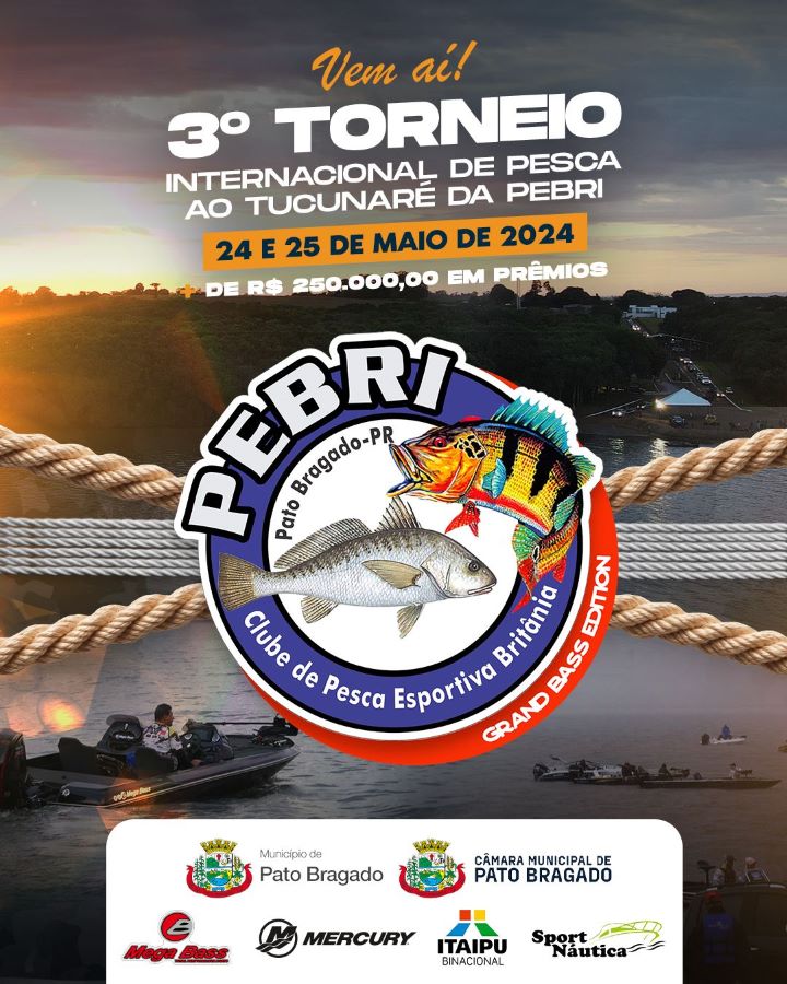 O Clube de Pesca Esportiva Britânia (Pebri) de Pato Bragado está promovendo as inscrições ao 3º Torneio Internacional do Tucunaré, que acontecerá nos dias 24 e 25 de maio. O processo deve ser efetuado pelo site (clique aqui).