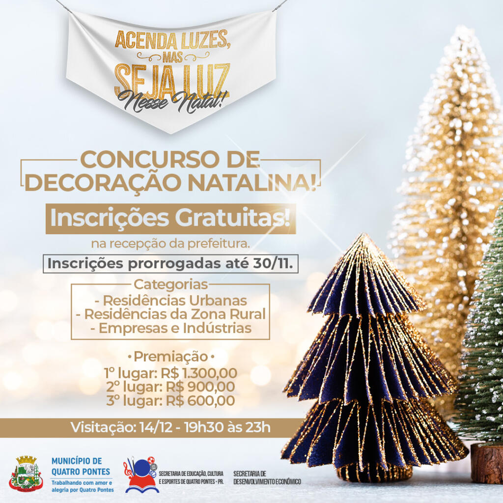 As Secretarias de Educação, Cultura e Esportes e de Desenvolvimento Econômico de Quatro Pontes encerram na quarta-feira (30) as inscrições ao Concurso de Decoração Natalina ‘Acenda luzes, mas seja luz nesse Natal’, que visa incentivar a população em transformar o município em um cartão de visitas, despertando o espírito e a magia que há nas tradições natalinas. As inscrições devem ser feitas junto à recepção da prefeitura, sem taxa.