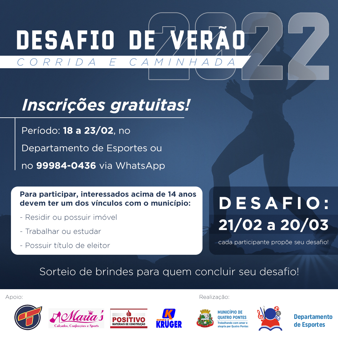 Até quarta-feira (23), os interessados em participar do Desafio de Verão 2022 Corrida e Caminhada devem efetivar a inscrição no Departamento de Esportes de Quatro Pontes, organizador do evento, junto ao Centro Poliesportivo Seno José Lang, das 08 ao meio-dia e das 13h30 às 17h30, ou enviar uma mensagem via WhatsApp no 99984-0436, sem custos.
