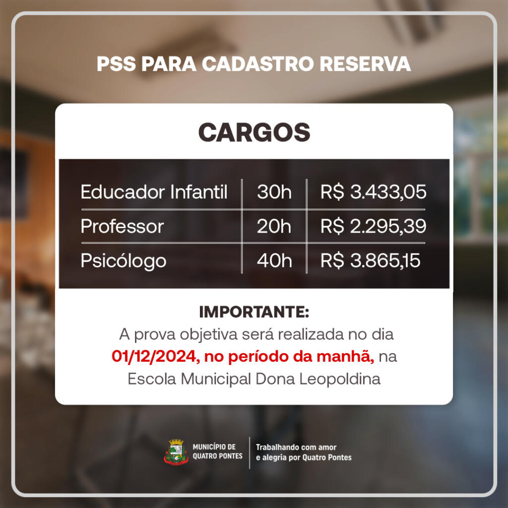 O edital do PSS também está disponível na aba “Concursos”, na lateral direita da página inicial no site oficial do município (www.quatropontes.pr.gov.br).