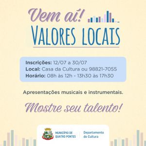 Os quatropontenses interessados em fazer uma apresentação instrumental ou musical nos “Valores Locais” têm até sexta-feira (30) para se inscrever. Os munícipes devem procurar a Casa da Cultura, das 08 horas ao meio-dia e das 13h30 às 17h30, para preencher a ficha, a qual também pode ser solicitada via WhatsApp no telefone 98821-7055. Neste caso, a mesma precisa ser devolvida com todos os dados requeridos e a assinatura do pai, mãe ou responsável.