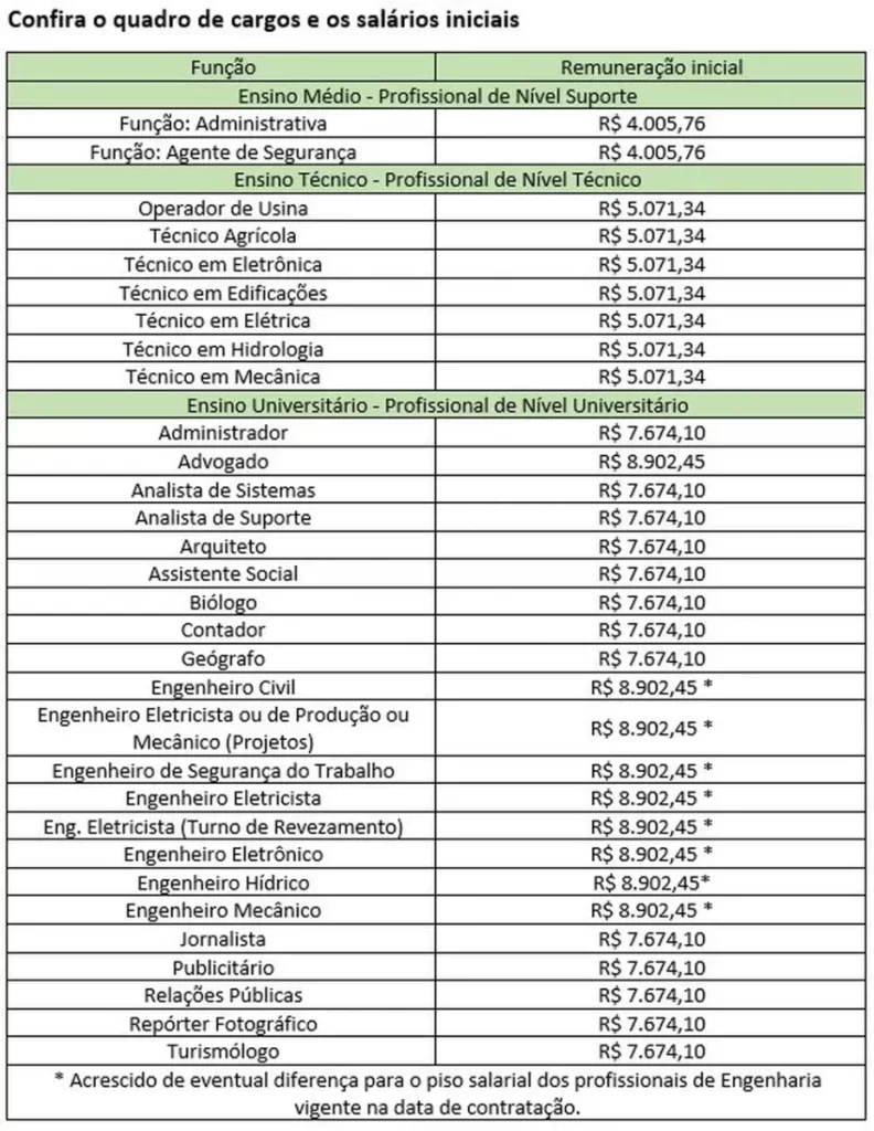 As oportunidades são para atuar em Foz do Iguaçu, cidade onde está localizada a margem brasileira da usina, além de Santa Helena, Guaíra e Brasília, no Distrito Federal.