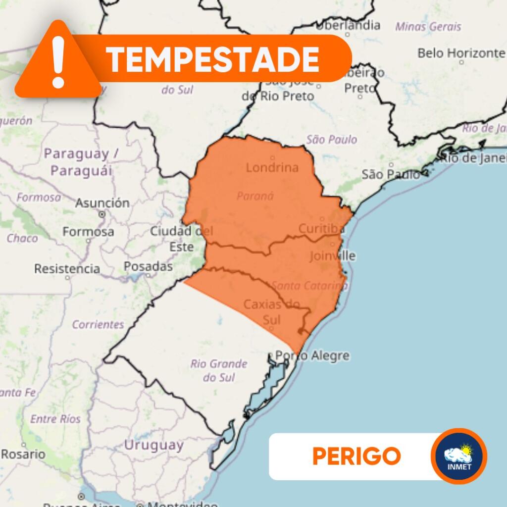 O Inmet, por sua vez, fez o alerta ontem (03) sobre a previsão de tempestade, entre hoje e amanhã (05), em áreas do Rio Grande do Sul e em todo o Paraná e Santa Catarina. O acumulado de chuva pode chegar a 100 mm em 24 horas, com ventos de até 100 km/h e queda de granizo.
