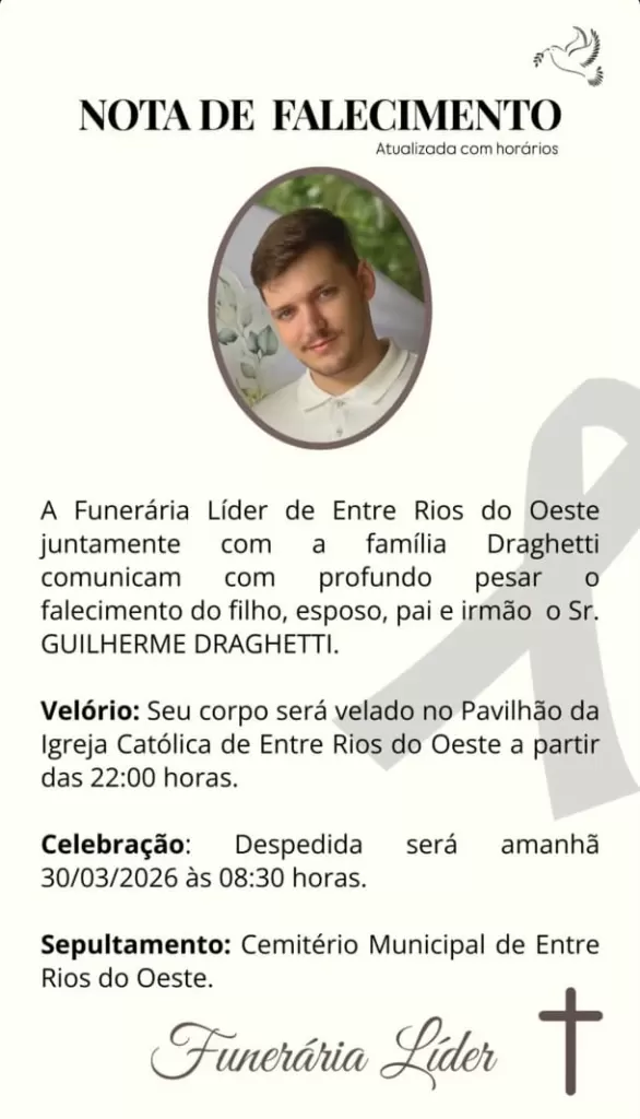 O velório será realizado em Entre Rios do Oeste, no pavilhão da Igreja Católica do município. Os horários devem ser informados pela família.