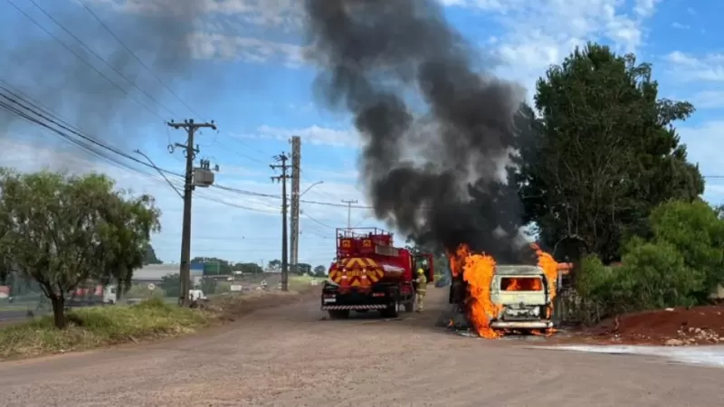 Uma Volkswagen Kombi foi completamente destruída por incêndio na marginal da PRC-467, em Cascavel, no Oeste do Paraná, na manhã desta quarta-feira (12).