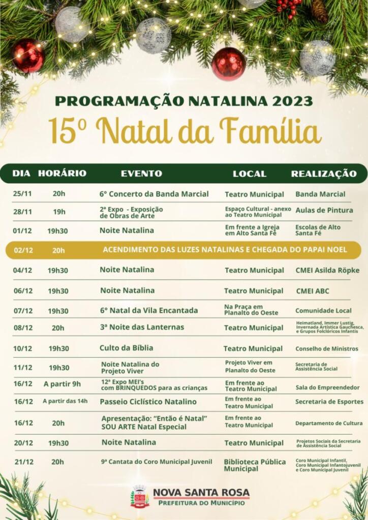 A programação oficial em Nova Santa Rosa inicia neste sábado (25), com o 6° Concerto Municipal da Banda Marcial, e encerra somente no dia 21 de dezembro, com a 9ª Cantata Natalina do Coro Municipal Infantil, Coro Municipal Infantojuvenil e Coro Municipal Juvenil. O acendimento de luzes está programado para ocorrer às 20 horas do dia 2 de dezembro, com a chegada do Papai Noel na Casinha do Noel, localizada na Praça da Bíblia.