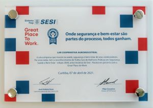 A Lar Cooperativa conquistou o Troféu Sesi em reconhecimento por excelente desempenho na gestão da segurança, saúde e bem-estar. A premiação é referente aos resultados apresentados na pesquisa aplicada pelo GPTW em 2020, e para eleger as empresas com melhores práticas são examinados os números sobre o clima organizacional e respostas de colaboradores a respeito das ações praticadas em prol das pessoas e minimização de riscos laborais.