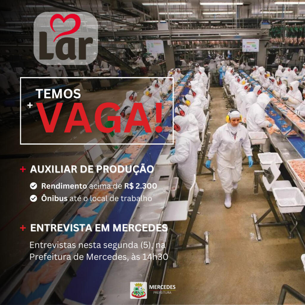 A Lar Cooperativa Agroindustrial está com oportunidades de trabalho abertas para trabalhadores de Mercedes. Na segunda-feira (6) serão realizadas entrevistas para os interessados. As vagas são para auxiliares de produção e os rendimentos passam de R$ 2,3 mil.