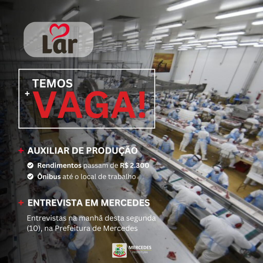 A Lar Cooperativa Agroindustrial anunciou a abertura de vagas de trabalho para trabalhadores de Mercedes. As oportunidades são para o cargo de auxiliar de produção, e os rendimentos oferecidos ultrapassam R$ 2,3 mil.