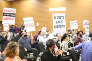 Em Cascavel, a audiência pública foi marcada por manifestação contra a outorga, o valor proposto para as tarifas e em desfavor da implantação de praça de pedágio entre Toledo e Cascavel (Foto: Dalie felberg/Alep)