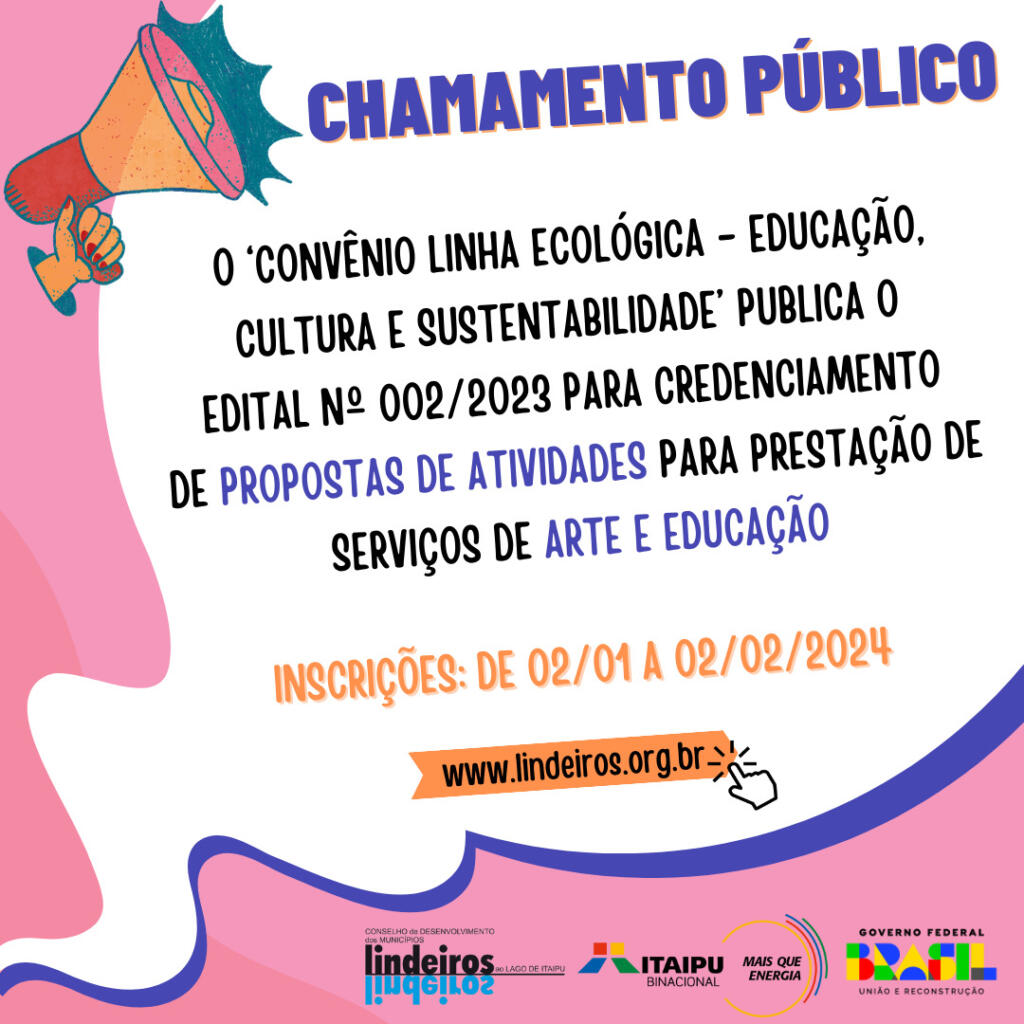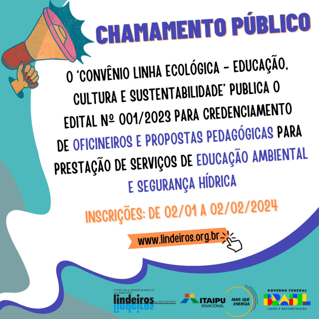 O Convênio Linha Ecológica: Educação, Cultura e Sustentabilidade, parceria entre a Itaipu Binacional e o Conselho de Desenvolvimento dos Municípios Lindeiros ao Lago de Itaipu, abriu o credenciamento de propostas e oficineiros para atividades voltadas à arte, educação e educação ambiental. As inscrições foram abertas no dia 02 de janeiro e se estendem até às 18h do dia 02 de fevereiro de 2024. Profissionais de toda a região Oeste do Paraná poderão participar.