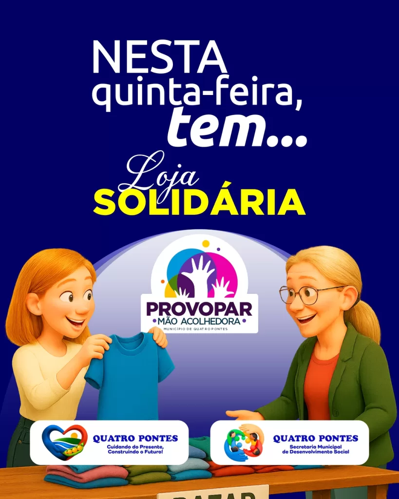 A Secretaria Municipal de Desenvolvimento Social informa que, nesta quinta-feira (11), a Loja Solidária – Mão Acolhedora retoma seu funcionamento normal em Quatro Pontes. O espaço estará aberto das 8h30 às 11h30 e das 13h30 às 17h30, na sede do CRAS.