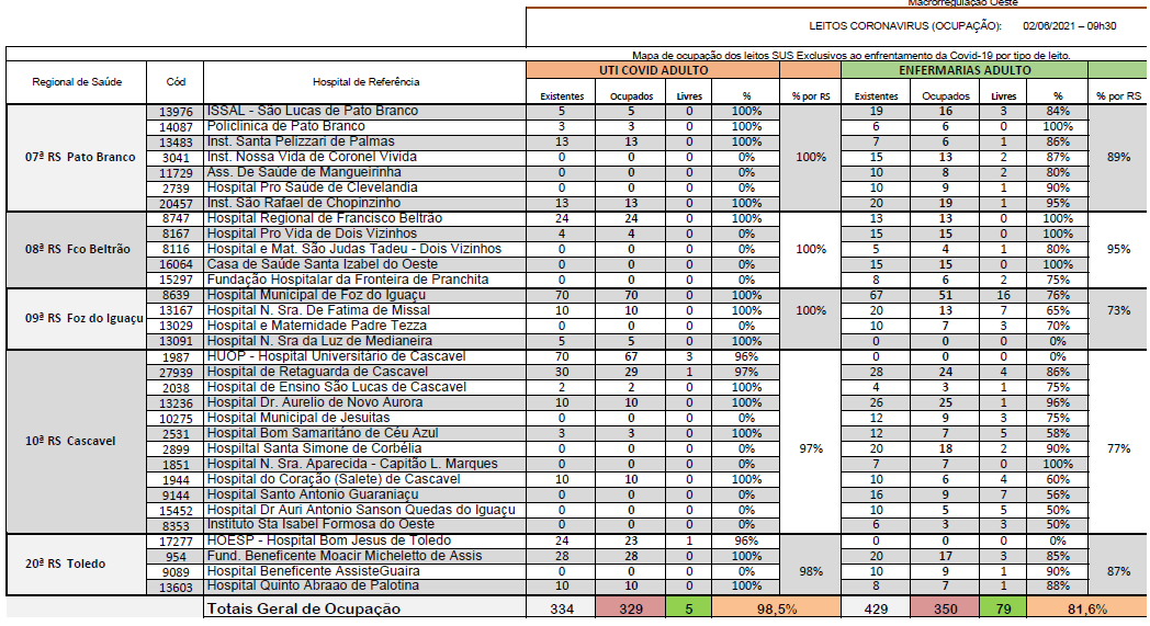 Três Regionais da macrorregião Oeste seguem com 100% dos leitos de UTI ocupados, as outras duas Regionais seguem com 97% e 98% de ocupação.