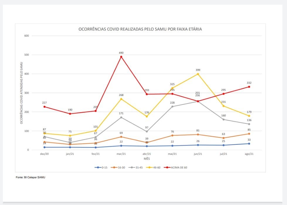 No mês seguinte, agosto, o registro de pessoas acima dos 60 anos cresceu ainda mais: 332. Entre 46 anos e 60 anos, 179; entre 31 anos e 45 anos, 136; entre 16 anos e 30 anos, 85; e abaixo dos 15 anos, 33. A estatística aponta ainda estabilidade no número de ocorrências Covid-19, após queda verificada entre junho e julho.