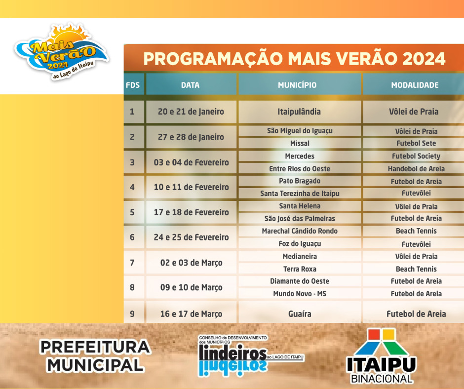 O calendário regional do Mais Verão 2024 já está definido, iniciando no próximo final de semana em Itaipulândia, nos dias 20 e 21 de janeiro, com vôlei de praia como modalidade principal. O evento percorrerá mais 15 municípios, São Miguel do Iguaçu, Missal, Mercedes, Entre Rios do Oeste, Pato Bragado, Santa Terezinha de Itaipu, Santa Helena, São José das Palmeiras, Marechal Cândido Rondon, Foz do Iguaçu, Medianeira, Terra Roxa, Diamante do Oeste, Mundo Novo (MS) e Guaíra, onde serão encerradas as atividades nos dias 16 e 17 de março.