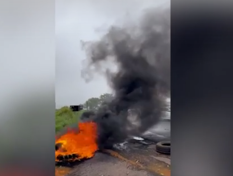 Manifestantes também estão reunidos na BR-163, em Mercedes. Barreira foi feita com pneus, os quais foram queimados.