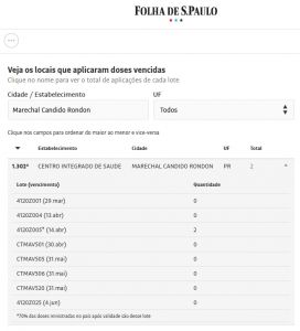 Até o dia 19 de junho, os imunizantes com o prazo de validade expirado haviam sido utilizados em 1.532 municípios brasileiros, aponta a matéria. Marechal Cândido Rondon consta na lista com duas doses aplicadas.