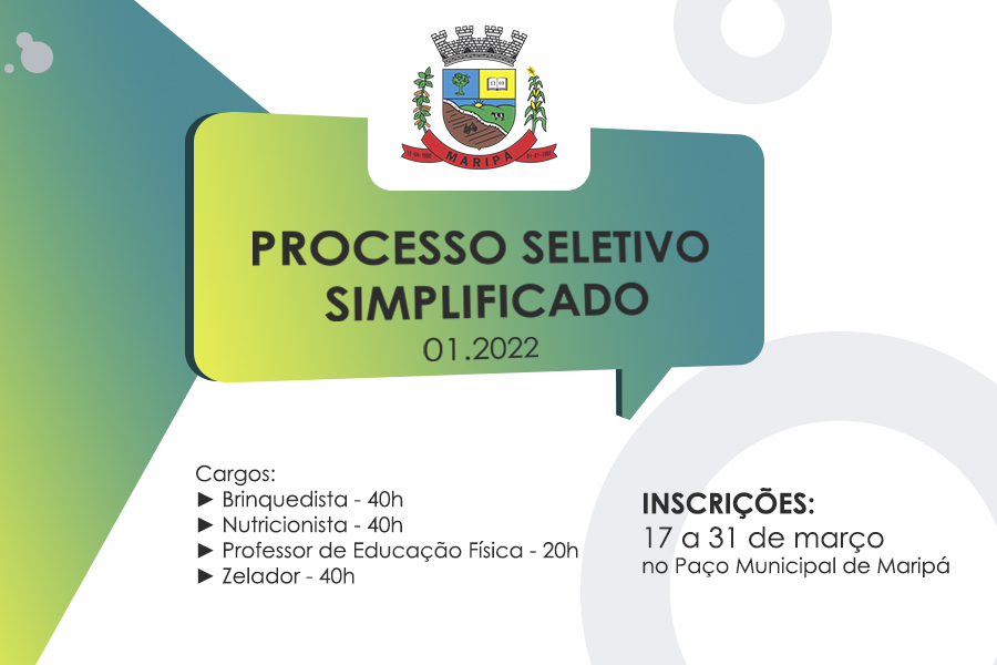 O Município de Maripá abre nesta quinta-feira (17) as inscrições para o Processo Seletivo Simplificado (PSS) 001/2022 para o preenchimento de vagas de brinquedista, nutricionista, professor de educação física e zelador. O contrato terá prazo máximo de 6 meses, podendo ser prorrogado por igual período ou conforme a necessidade.