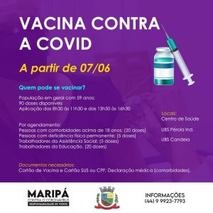 A aplicação está sendo realizada diariamente das 8h30 às 11h30 e das 13h30 às 16h30, no Centro de Saúde de Maripá e nas Unidades Básicas de Saúde dos distritos de Candeia e Pérola Independente. É necessário apresentar a Carteira de Vacinação e o CPF ou Cartão SUS, além da declaração médica comprovando comorbidade, no caso deste público-alvo específico.