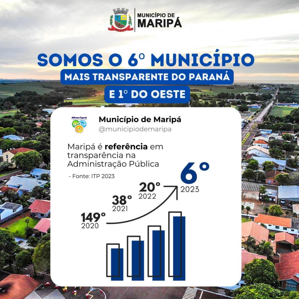 Com nota 98,14%, Maripá conquistou a 6ª posição no ranking dos municípios mais transparentes do Paraná e lidera o ranking do Oeste. Os dados são do Índice de Transparência da Administração Pública (ITP-PR) relativo ao ano de 2023 realizado pelo Tribunal de Contas do Estado do Paraná (TCE-PR) e divulgado nesta segunda-feira (13).